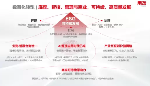 数智化转型,需要一个能盖提供可持续发展原动力的数智化底座。需要精准经营事项,实时数据穿透,助力企业从业财/管融合到业财/管合一的升级;在AI普及时代,需求极致的用户体验,场景颠覆创新;需要与生态共创共赢,从产业互联到价值网络升级。从而最终达成可持续发展的商业与社会环境。