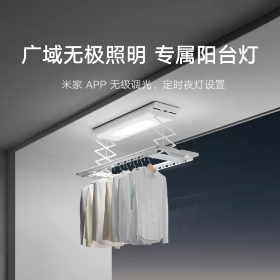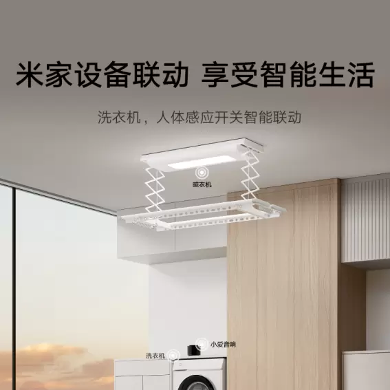 米家智能晾衣机1S还解锁了更高级的玩法,可以接入小米智能生态,与米家洗衣机、人体识别开关联动,洗衣结束晾衣机自动下降,人来自动亮灯,让生活充满趣味和高级感。此外,米家智能晾衣机1S的无级照明,宽域调光也非常有必要单独拿出来说一说,自带20W高亮大屏LED灯,支持无级调光和定时夜灯功能,自由控光,光线明亮柔和,无惧大件衣服遮挡,完美替代阳台灯,让你的阳台氛围更加有品。