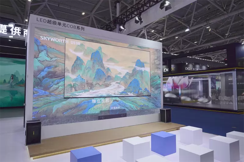 随着工艺进步,在像素点间距变小的趋势下,COB的综合成本优势将越来越明显。创维商用在此次展会带来的LED超级单元COB系列就采用的是全倒装MiniLED发光芯片结合创维多膜COB封装工艺技术,该技术大大提升了产品显示或黑屏状态下的一致性,无马赛克现象。让对比度和可视角度表现更好,细节表现更佳。