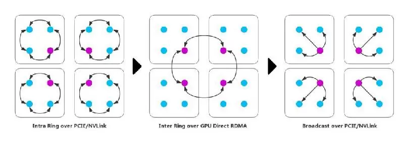 (3)GDR技术加速Ring Allreduce:在前述方案的基础上,将GDR技术应用于跨节点Ring,这减少了主存和显存之间的Copy操作,同时为GPU执行规约计算提供了便利;