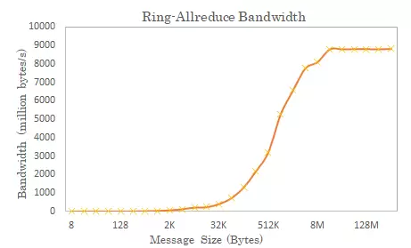 (2)Ring Allreduce算法对小Tensor不够友好。算法将待规约的数据拆分为N等份(N为节点总数),这导致节点数大幅增加时,Tensor碎片化,通信网络传输大量小数据包,带宽利用率很低。