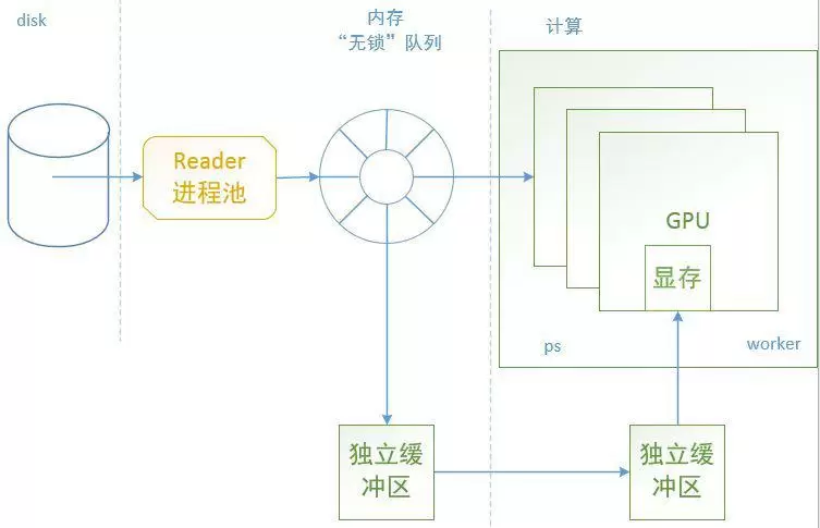 机智团队为解决IO问题,将训练样本集部署在由SSD盘组成的存储系统上,以保证CPU访问数据的带宽不受网络限制;同时,更为关键的是引入了Pipeline机制,该机制将一次训练迭代中的数据读入及处理和模型计算并行起来,在做模型计算的同时做下一轮迭代的数据读取处理并放入自定义“无锁”队列,并通过GPU预取机制提前把处理好的数据从队列中同步到GPU显存中,当做下一轮的模型计算时直接从显存读取数据而不需要再从CPU或磁盘读取,做到将数据读取隐藏,IO和计算并行起来。