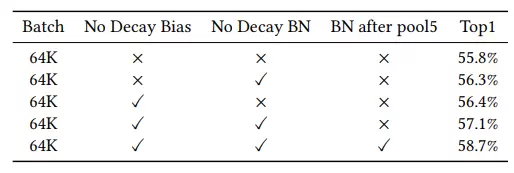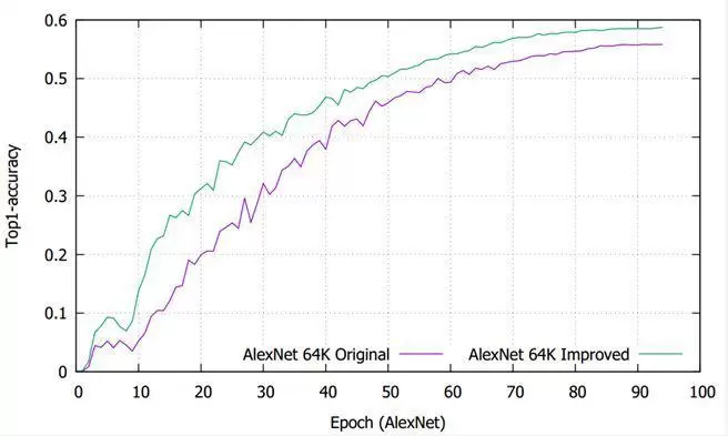我们在32K下复现了You et al. (2017)的测试结果,但batch size扩展到64K时,训练精度未能达到基准准确性。为了提高在64K下的收敛准确性,我们对参数和模型进行了改进:1) 只对weight做正则化。 2)在You et al. (2017)模型的基础上,进一步改进AlexNet模型。