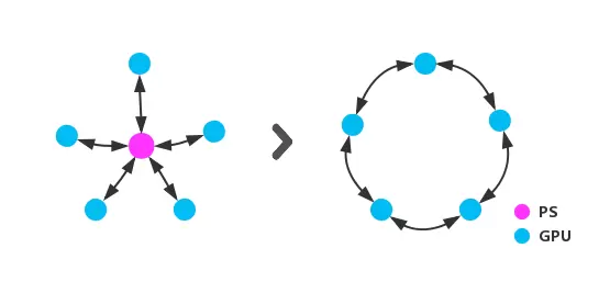 分布式训练数据并行模式下,经典的部署方式是独立的参数服务器(ParameterServer)来做训练过程中梯度的收集、分发和更新工作,每一次迭代所有的GPU都要与PS多次通信来获取、更新参数;当节点超过一定数量时,PS的带宽以及处理能力将成为整个系统的瓶颈。