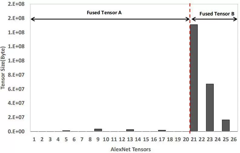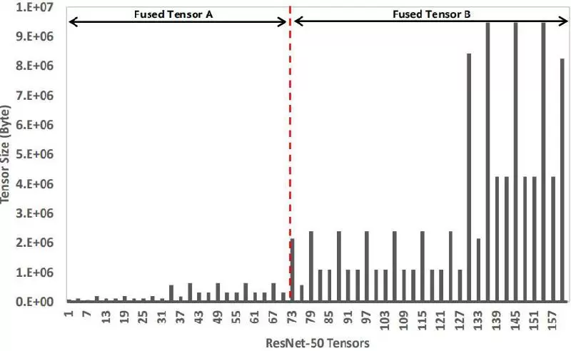 (2)梯度融合,多次梯度传输合并为一次:根据具体模型设置合适的Tensor size阈值,将多次梯度传输合并为一次,同时超过阈值大小的Tensor不再参与融合;这样可以防止Tensor过度碎片化,从而提升了带宽利用率,降低了传输耗时。