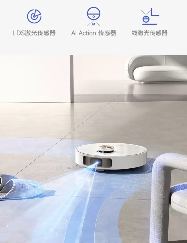 识别多样的地面材质和复杂的家具陈列对扫地机器人来说绝对是重要挑战之一,如果没有可靠的避障技术加持,不仅无法保证良好的清洁效果,严重时还会对家具造成损坏。通常扫地机器人会配备双线激光来识别周围障碍物,但识别种类及响应速度都较为有限。而追觅S20系列扫地机器人则采用了双重保险,通过双线激光+AI的搭配组合,能更加快速、精准地识别超45种障碍物,并及时避让。无论墙边、门槛、楼梯台阶还是其他复杂区域,追觅S20系列都能轻松应对,即使暗光环境下也可灵活绕行。