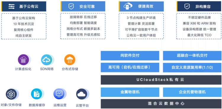 优钛私有云UCloudStack基于 UCloud 公有云基础架构,提供虚拟化、SDN、分布式存储、运营运维及云管平台等核心能力,同时可提供数据库、缓存、对象及文件存储等 PaaS 组件服务。3节点即可构建生产环境且可平滑扩容,不强行绑定硬件及品牌,可同时部署 X86 和 ARM、MIPS混合架构。借助私有云管理平台提供的资源智能调度和超分特性,可满足资源高可用和资源高复用的需求和场景,为用户降本增效。