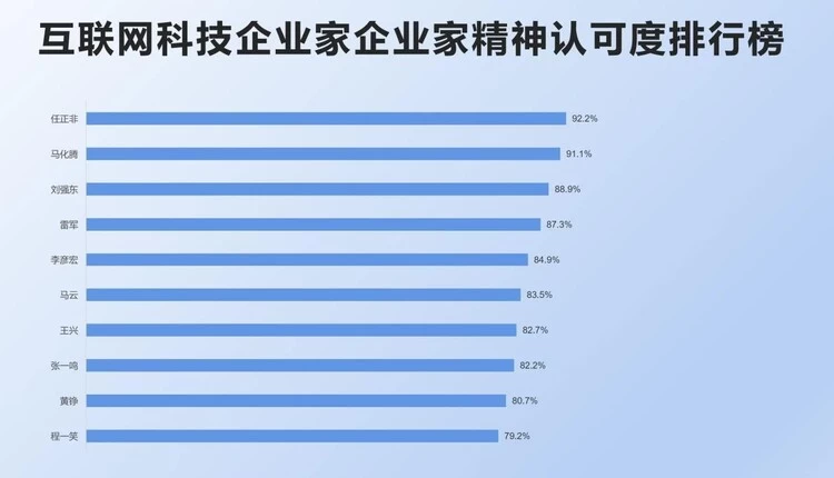 企业家精神榜单上,公众对10家受调研互联网科技企业家具备企业家精神认可度基本都在80%以上,任正非、马化腾排名前两位,认可度均超过90%。