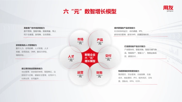 引入轻咨询服务。六“元”数智增长模型的提出,帮助成长型企业能够在数智飞轮的基础上快速找到数智创新的切入点。“六‘元’数智增长模型是把56个数智飞轮进一步分类,是用客户的语言帮助客户理解需要突破的点到底是在产品、交付、市场,还是财务、人力、运营,相当于我们给他做了一个顶层规划。”