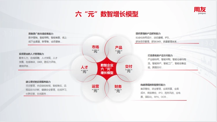 如何才能更好地满足成长型企业复杂多变的数智化转型需要,帮助他们实现高效增长?用友依托自身多年服务企业数智化转型的经验,提出了成长型企业六“元”数智增长模型,从六个方面入手,助力成长型企业高效增长,分别是研发能力、交付能力、市场获客能力、财税管控能力、人才管理能力和运营服务能力。