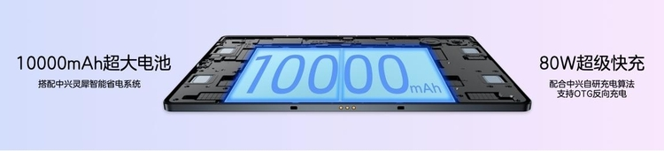 中兴AxonPad拥有10000mAh的超大电池搭配中兴灵犀智能省电系统,80W超级快充配合中兴自研充电算法,在保证了移动办公的长久续航的同时,能够大大节省充电时间,短时间内便能瞬间回血。该平板还支持15W OTG反向充电,能确保在关键时刻发挥应急作用。