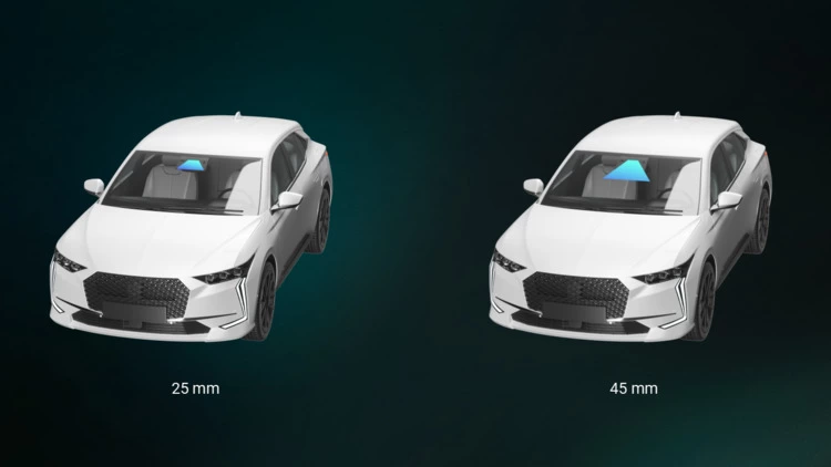 所有集成于座舱上方的传感器都需要与挡风玻璃之间留有一定的空间,称为 Keep Out Zone (KOZ)。而传感器的厚度越大,其所需要的 KOZ 也越大,比如 25 mm 厚的 ET25,与 45 mm 厚的其他远距激光雷达相比,其 KOZ 要小一半以上。因为传感器支架置于驾驶员上方,更小的 KOZ 能够更少地占用座舱空间,有效降低对驾驶员视野的影响。