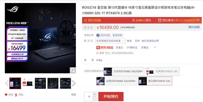 13900H+满功耗RTX4070 高性能全能本ROG幻16星空版首发预约16499元