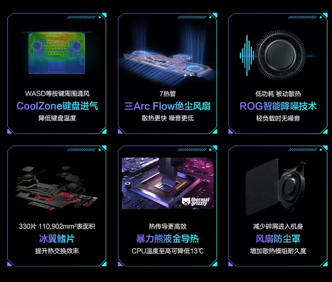 为进一步提升创作时的舒适性,ROG幻16星空版重新规划了内部结构,带来了ROG冰川散热架构3.0。在拥有3绝尘风扇+7热管的豪华散热规格基础上,在出风区域覆盖了319片冰翼鳍片,通过内吹式散热技术,极大提升了整机的热交换效率,CPU表面还涂抹暴力熊液态金属导热介质,导热能力比传统硅脂更加出色,即使进行高负载创作,性能也丝毫不减,操作体验依旧清爽舒适。而在低负载运行时,得益于ROG智能降噪技术的加持,整机可实现0dB运行,办公创作更安静。