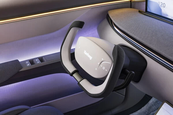 多功能一片式智能方向盘会自动激活点亮,该方向盘具有支持多种交互方式的智能表面,带动态灯光的透光表皮可提供特有的奢华体验。