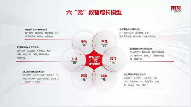 通过六“元”数智增长模型,用友更清晰的展现了成长型企业的增长点和创新点,客户也更清楚自己需要构建什么样的综合能力,短板在哪里。在这一模型下,用友与客户的沟通也变得简单,缺哪块就针对性地补哪块。