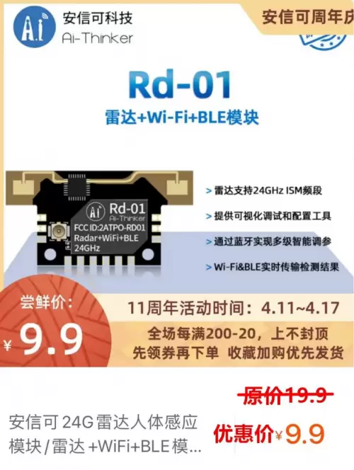 安信可Ai-Thinker新品24G人体存在感应模组Rd-01,集小体积、低功耗、高灵敏度、高性价比和高性能等优点于一体,将赋能更多物联网赛道的智能应用设备。