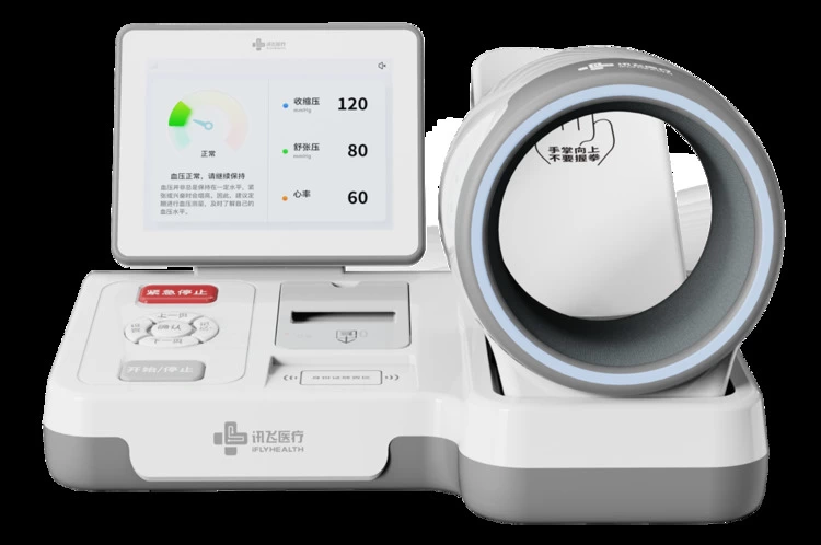 讯飞医疗研发新品另辟蹊径,通过示波法+柯式音法的“双模式融合测量”,同时兼顾了示波法稳定性高、柯式音法精准性高的两重优势。患者只需将手臂置入专利臂筒中,三秒自动收紧,听诊头自动固定,快速稳定舒适测量。设备左侧的高清显示屏可以实时显示测量结果,测后迅速生成打印检测报告,为医生诊断推理提供依据。