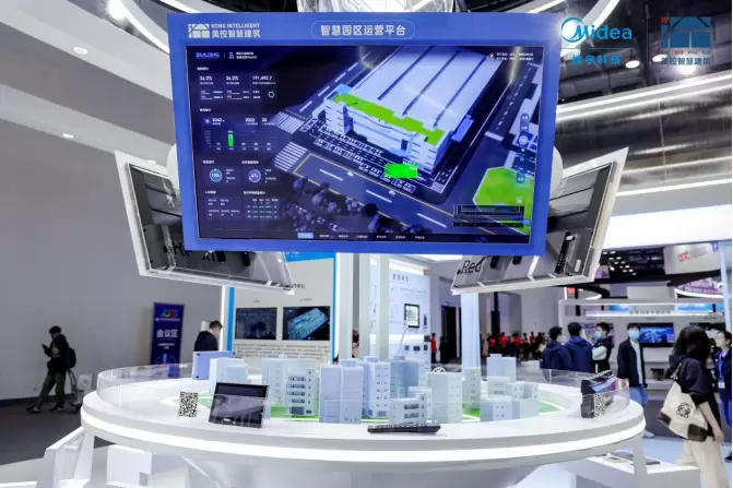 「iBUILDING展区」展示了基于iBUILDING美的楼宇数字化平台,从设备、平台到应用和解决方案的楼宇智慧化、低碳化全栈式服务。基于iBUILDING平台自有数字孪生中台能力及多源数据高效对接能力,实现了园区内的多维度数据融合展示,包含“综合态势”、“能源态势”、“碳排态势”等态势页,助力园区运营“状态可视”“事件可控”“业务可管”。