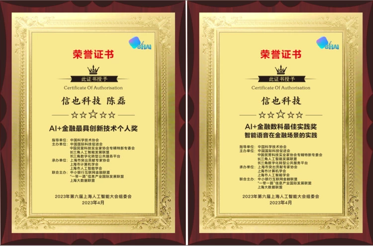 凭借在金融科技领域的长期不懈耕耘与创新驱动发展,信也科技还荣获大会两项大奖。仅智能语音领域,信也科技在机器人自动化进阶、智能坐席搭档、声纹识别等方面形成了一系列的创新性解决方案,在国内和国际赛道中具有显著的业务效果和行业优势,荣获“AI+金融数科最佳实践奖”;在创新技术领域,信也科技副总裁、大数据及AI负责人陈磊带领团队用科技提升消费金融的智能化水平,多技术组合打造覆盖全金融服务周期的智能化产品,荣获“AI+金融最具创新技术个人奖”。