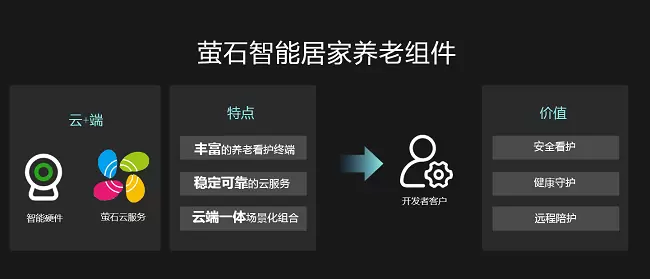 针对养老行业中急需智能产品和智能应用提升看护能力,实现数字化升级的方案商、集成商。萤石网络推出了智能居家养老工作站——以萤石云平台为基础,萤石自研及生态硬件为服务终端,以组件化形式开放给客户快速集成的行业级平台型产品,为智慧养老行业客户提供设备接入及管理,云端数据智能处理等软硬件一体化的能力,解决客户智能化选品难,对接耗时低效及场景构造慢的问题,助力快速搭建智能养老方案。