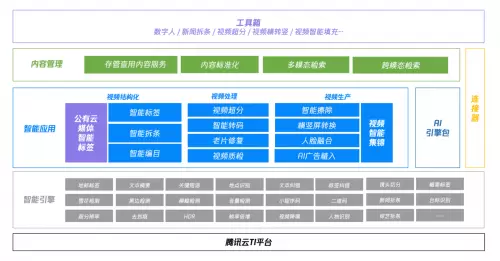 腾讯云智能媒体AI中台自发布以来不断迭代,已经研发出标签、编目、拆条、转码、超分、智能擦除、老片修复、横竖屏转换、视频质检等超十项应用,并完善了上层支持媒资智能存管查用的内容管理库和工具箱,探索并解决了越来越多传媒业务的实际及潜在需求。