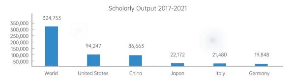 《报告》显示,2017-2021年全球肿瘤领域的学术产出共计324,753篇,其中美国位列第一(占比22%),中国紧随其后,位列第二(占比20%),其次是日本、意大利和德国。