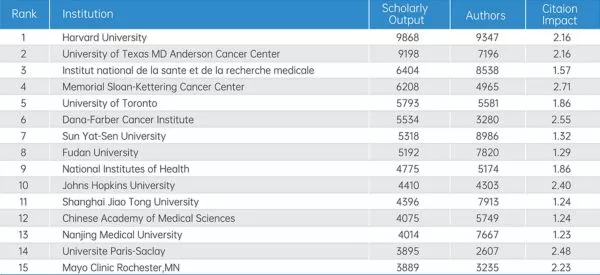 5家中国机构跻身全球肿瘤研究学术产出Top 15