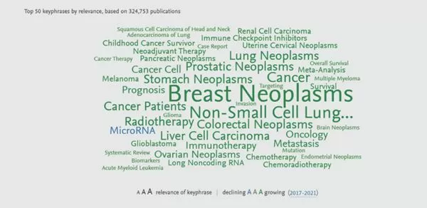 就研究主题而言,全球肿瘤领域的研究主要集中在乳腺肿瘤(Breast Neoplasms)、非小细胞肺癌(Non-Small Cell Lung Cancer)、结直肠肿瘤(Colorectal Neoplasms)、前列腺肿瘤(Prostatic Neoplasms)、胃肿瘤(Stomach Neoplasms)、肝细胞癌(Liver Cell Carcinoma)等热点研究内容上,且近年来相关研究还在不断上升。