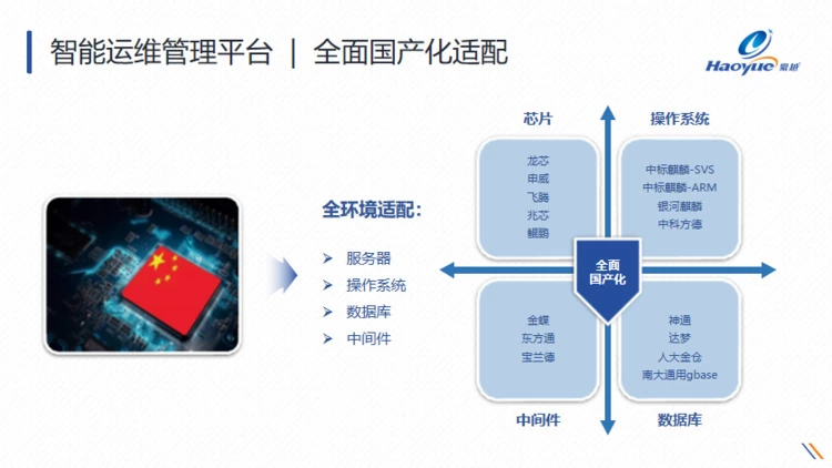 豪越深耕智能运维领域十余载,目前拥有自主研发且兼容国产化要求的全系列智能运维产品,可以提供一站式智能运维解决方案,满足国产化替代的运维需要。