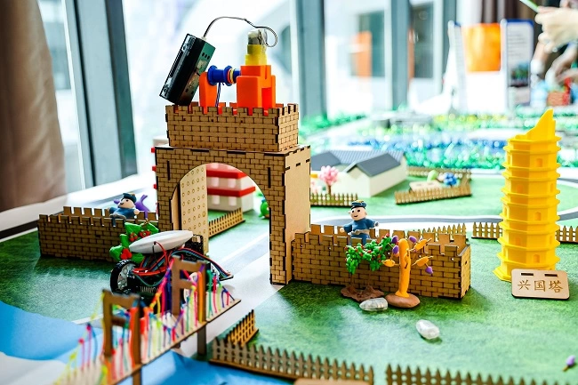 另一件金鹅伴奖作品《南江北抚——家乡印象》,则是由江苏江阴市城南中心小学和辽宁省抚顺市望花区中心小学的师生共同完成。作品以南北文化、雷锋精神为设计灵感,运用3D打印、激光切割等技术制作了“最美江阴”和“抚顺印象”两大场景。两所学校的师生在共创作品过程中,大大加深对对方历史文化的了解。