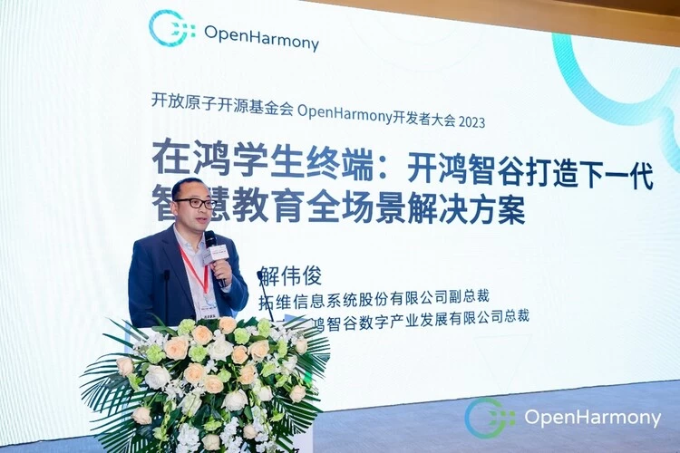 开鸿智谷总裁解伟俊受邀在OpenHarmony大会2023商业生态分论坛发表主旨演讲,公开分享基于OpenHarmony打造的在鸿学生终端,并围绕构建的教育行业生态及快速落地的商业和创新经验。