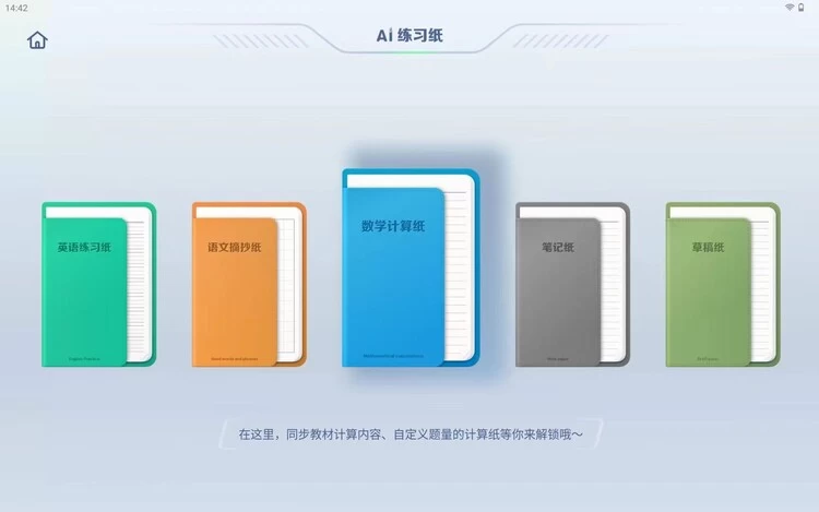 值得一提的是,无纸化学习也逐渐成为实现零碳生活的新风尚。科大讯飞AI学习机内的AI练习纸为孩子们提供了无纸化学习的新选择。AI练习纸一共提供了五种类型的笔记纸供孩子们选择:英语练习纸、语文摘抄纸、数学计算纸、笔记纸和草稿纸。数学计算纸下还支持新建口算练习,孩子们可以根据自己的需求,自定义个性化练习,可以选择教材版本、题目类型、题目数量等。在完成题目后,学习机还会自动识别答案并进行批改反馈。语文、英语的词句摘抄积累也可以在AI练习纸中完成。而且,孩子们还可以用AI练习纸中的草稿纸打草稿、做演算。电子化的草稿纸可以重复利用,一定程度上减少了纸张的浪费。