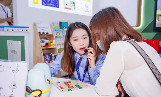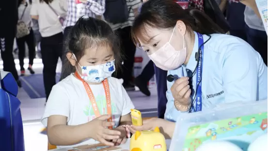 展台一侧,小朋友们刚把绘本放好,AI绘本阅读机器人就边眨眼睛,边读绘本内容。阅读过程中,AI绘本阅读机器人时不时与小朋友进行互动交流。另一边,参展人士有的在摆放编程卡片,操作淘小鹰编程机器人抵达指定位置完成任务;有的在试戴智能可穿戴设备,参与体能测试……众多高科技幼教装备产品带给参展人士新奇体验,也收获了优质口碑。“机器人可以随时点播好听的故事,还可以自己读绘本,看上去很亮眼,体验后很惊喜!”30岁的李女士感慨,这样的高科技产品所呈现出的“未来幼教课堂”令人难忘。