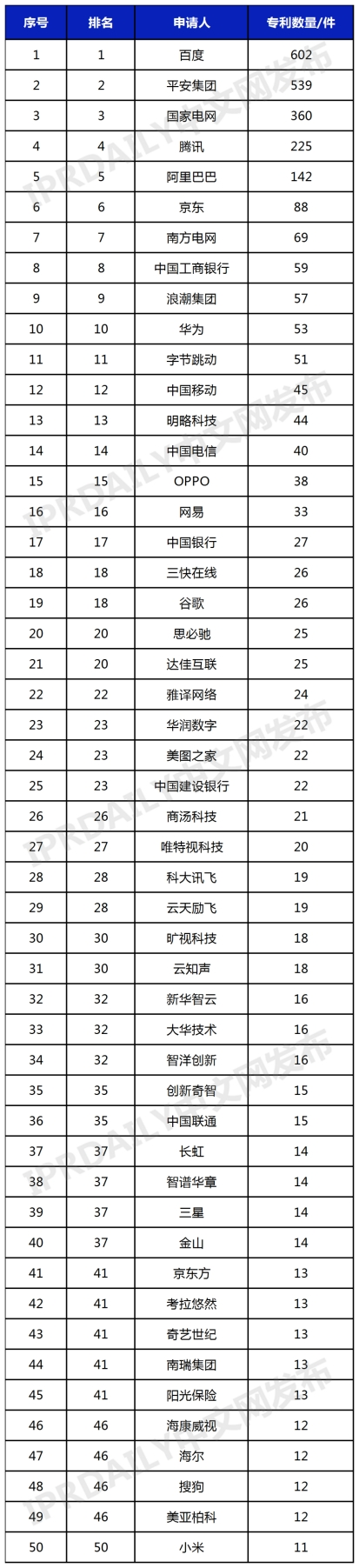 基于对人工智能大模型技术的理解,全球领先的知识产权综合信息服务提供商IPRdaily通过对相关的关键词和分类号进行限定,数据统计2017年1月1日至2023年3月17日在中国申请并公开的人工智能大模型专利(同申请号合并),发布中国人工智能大模型企业发明专利排行榜(TOP 50)。榜单如下: