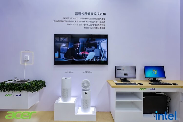 展会现场,宏碁以高性能扩展工作站Veriton T850为运算核心,配合Veriton 系列智慧课堂教学用机、智慧课堂教学大屏等设备布置出宏碁智慧课堂的应用场景,并且展示宏碁智慧课堂云教育系统,通过多设备信息互通互联、实现高效教学信息传输,提升数字时代的智慧课堂场景学习效率,这种多设备软硬件结合的解决方案,能够灵活部署,满足不同教学环境需求,在数字教育时代用创新科技促进教育公平性,此外面临不同环境健康安全问题,宏碁结合抑菌技术带来超氧抑菌机、空气净化器等产品将更安全可靠的受教育环境带给更多学子。