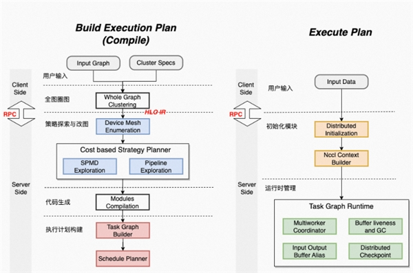 在功能方面,TePDist分为两个部分。一是在HLO IR上进行SPMD(Data Parallel和Sharding)和Pipeline并行的策略搜索。并以此构建编译基于Task Graph的执行计划。二是高效运行执行计划的分布式执行引擎。同时,TePDist提供了不同优化级别,高优化级别更加追求分布式策略质量,低优化级别会额外采取一些Heuristic,以较为微小策略质量牺牲,换取更快地搜索时间,以此满足落地需求。