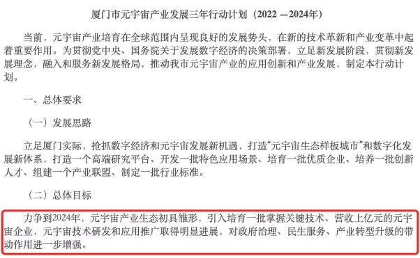 当前,厦门正着力打造“元宇宙生态样板城市”和数字化发展新体系。据不完全统计仅2022年厦门就有12份政府公开文件提及发展建设“元宇宙产业”。在2022年3月出台的《厦门市元宇宙产业发展三年行动计划》中还特别提及,力争到2024年……元宇宙技术研发和应用推广……对政府治理、民生服务、产业转型升级的带动作用进一步增强。