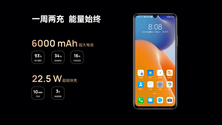 6000mAh 大电池+22.5W 超级快充:强劲续航,无忧畅享