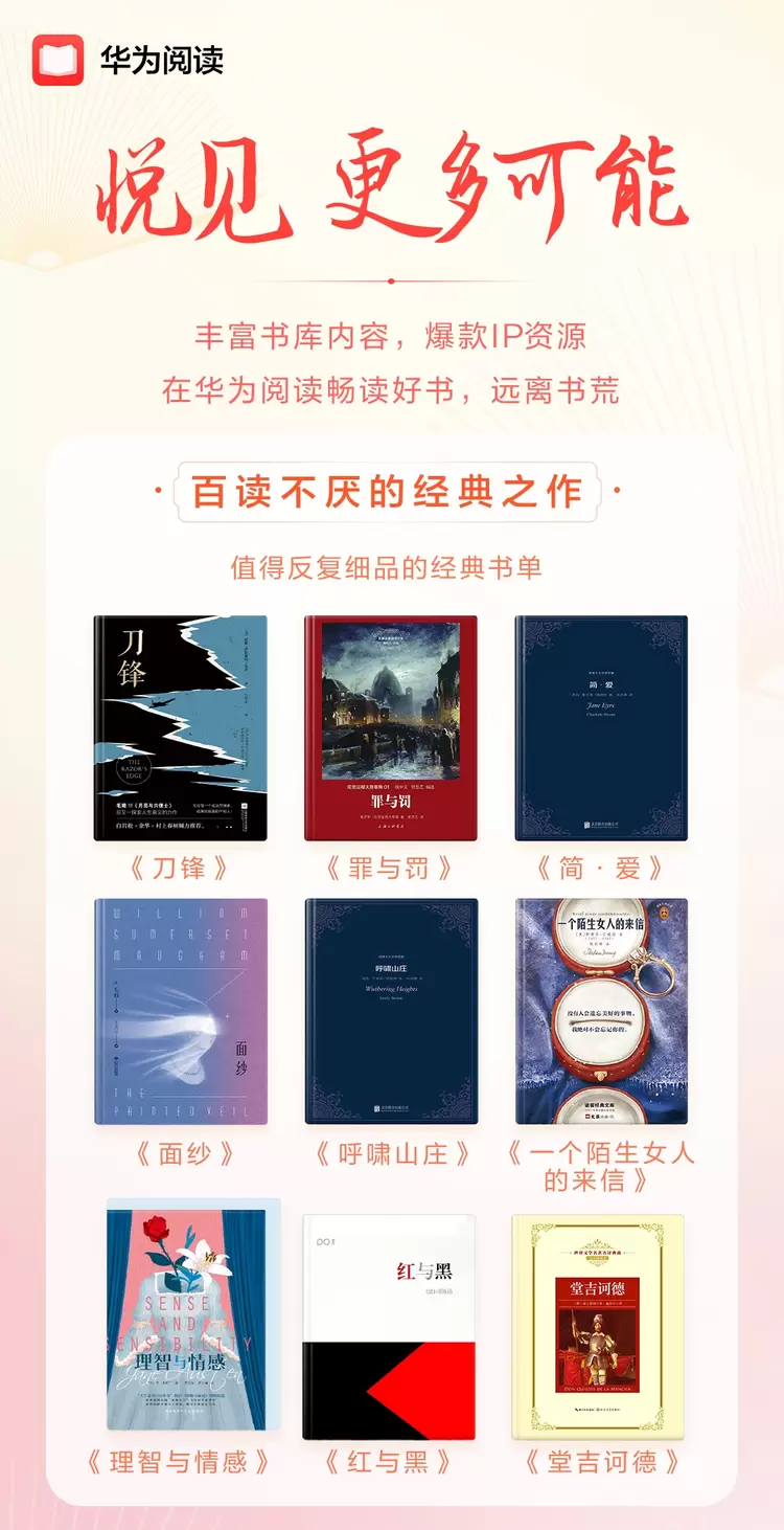 此外,世界读书日这天,华为阅读进一步丰富书库内容,让读者尽享爆款IP资源。值得反复细品的经典书单中,《刀锋》《罪与罚》《简·爱》等10本经典之作等你重温;