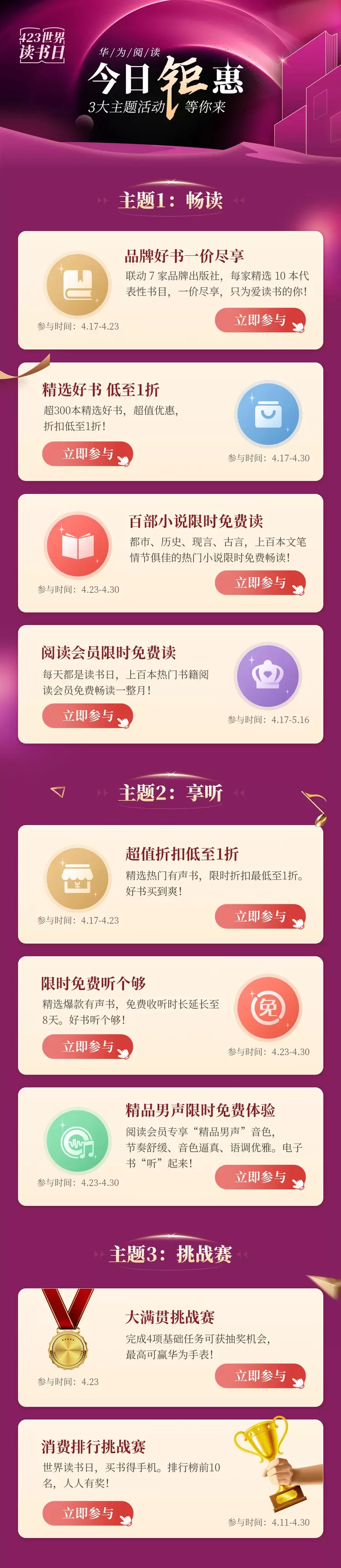 为了迎接世界读书日,华为阅读可谓是诚意满满,不仅精心为读者推出以上精选书单,还推出一系列丰富活动。超300本精选好书、精选热门有声书超值优惠,限时折扣低至1折,上百本热门小说限时免费畅读。更有精彩挑战赛等你参加,完成指定任务还有机会获得华为手机、手表等。活动多多,去华为应用市场搜索下载“华为阅读”app即可参加。这个世界读书日,一起在华为阅读中感知阅读新魅力吧!