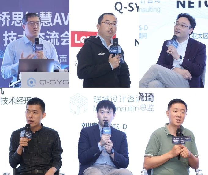 Q-SYS Partner合作伙伴讨论会由Q-SYS中国市场拓展经理李菁京(左上)主持,嘉宾包括:联想大客户事业部智能协作高级经理吴敏(中上),NETGEAR亚太区商业拓展技术经理郭浩航(右上),SENNHEISER商务通讯南区销售经理张琛(左下),珉诚智能工程有限公司音视频设计顾问刘博泱(中下)、深圳市奇正设计顾问有限公司设计总监汪晓琦(右下)。