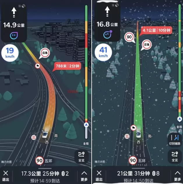 此外,腾讯地图通过对车辆、道路及周边环境进行3D风格化还原,实现更 “沉浸式”的车道级导航。城市道路及周边树木、建筑楼宇,还有用户车标,都以三维立体模型呈现,呈现更加精细化、逼真化的导航图。根据用户当前所在地时间早晚和天气情况,导航还会同步切换极具沉浸感的氛围模式。例如清晨阳光明媚绿树成荫,夜晚万家灯火沿街亮起,下雪天还可以展示雪花飘落的效果,沉浸式的展示效果让路况实景尽收眼底,为用户带来更直观、立体、易懂、人性化的导航体验。