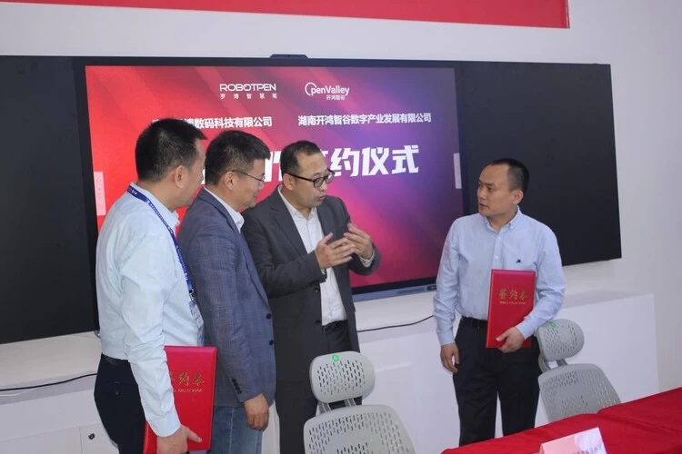 拓维信息副总裁、开鸿智谷总裁解伟俊,罗博科技CEO殷述军,开鸿智谷智慧教育解决方案总监谭秋桂,罗博科技市场总监张小涛及相关负责人共同出席签约仪式现场。