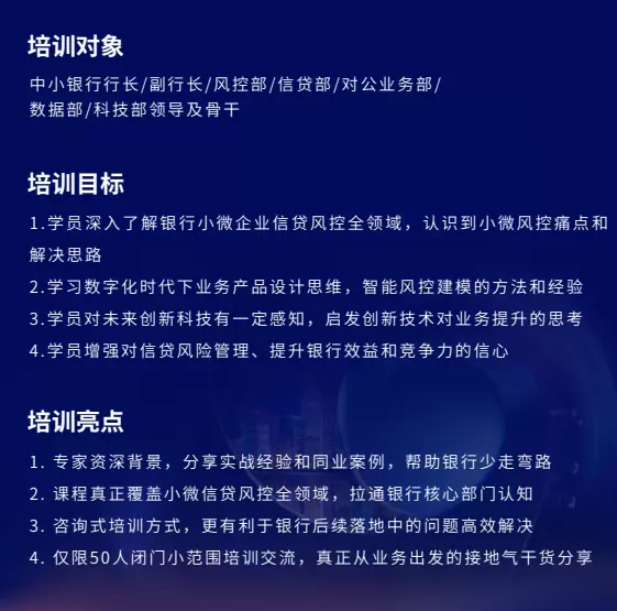 围绕AI助力银行小微企业信贷风险管理主题,全面深入了解业务产品设计、小微信贷风控全领域、智能风控建模的方法和经验,分析同业成功案例和走过弯路。