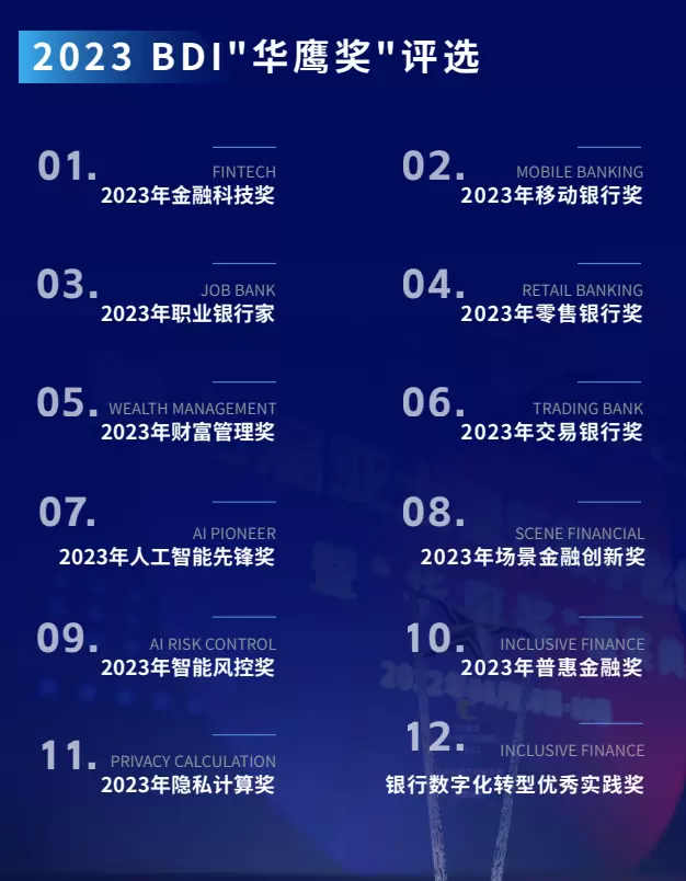 “BDI华鹰奖”颁奖典礼将在峰会现场进行,届时将颁发年度金融科技奖、移动银行奖、职业银行家等多项奖项。