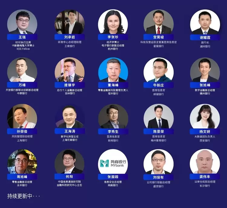 为此,本届BDIE特邀卡耐基梅隆大学博士 IEEE Fellow -王强、中国信息通信研究院金融科技研究中心主任-何阳、工商银行研发中心总经理助理-刘承岩、星展银行(中国)有限公司科技及营运部主管兼首席信息官-宫宵峻、杭州银行电子银行部副总经理-李张珍、网商银行信息安全总经理-张园超、中原银行开放银行部联合创新部总经理-万峰等学术界、咨询行业以及银行业等不同领域专家学者,从数据&技术驱动银行数字化转型出发,聚焦创新技术应用,探讨数字化赋能银行业务发展破局点,助力银行高质量发展。