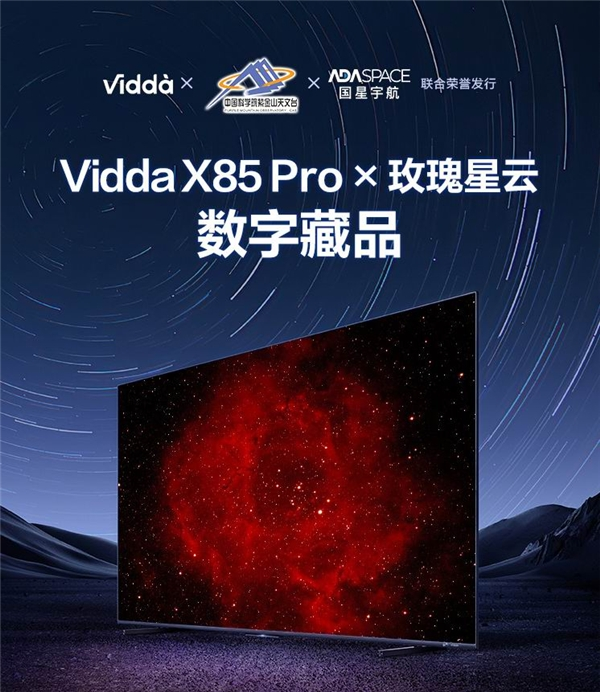 目前,海信旗下年轻潮牌Vidda已经开启全新旗舰影游大屏电视 Vidda X85 Pro的预售。4月26日20:00,该机即将开始抢付尾款活动。除了丰富的首销福利,首批购买Vidda X85 Pro的用户还有机会免费领取Vidda、中国科学院紫金山天文台、国星宇航三家联名发行的“Vidda X85 Pro × 玫瑰星云数字藏品(NFT)”。