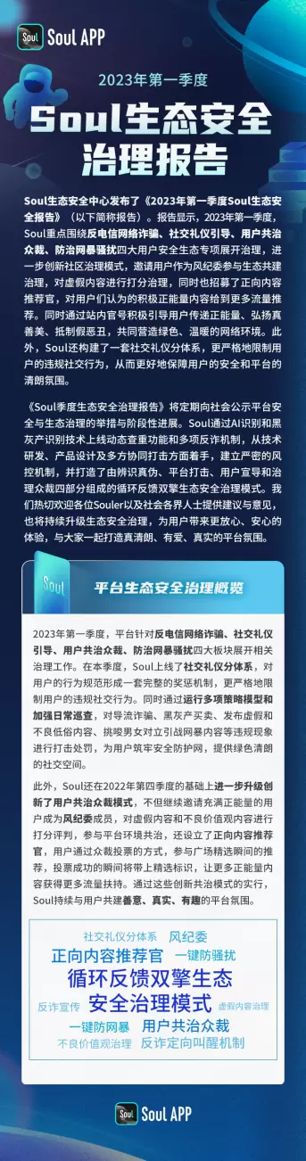 《2023年第一季度Soul生态安全报告》发布,平台反诈启动定向叫醒机制