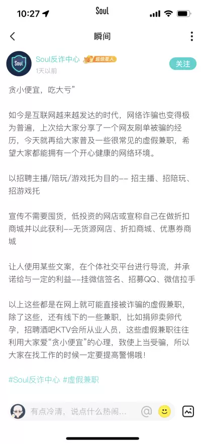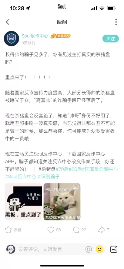 作为平台反诈防骗的主阵地,Soul反诈中心持续专注反诈案例的宣传,并启动定向叫醒机制。据了解,2023年一季度,Soul反诈中心的推送文案和叫醒信息更加精准,会针对不同诈骗类型,针对不同易感人群定向发送提醒文案,从而及时阻断诈骗流程,防止用户上当受骗。